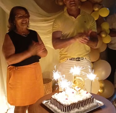 As flores, com sua presença marcante, trouxeram vida e sofisticação à decoração, destacando cada detalhe da mesa e criando uma atmosfera acolhedora e inesquecível. Entre sorrisos, abraços e pétalas, o cenário floresceu em amor e gratidão, tornando o aniversário de Célia e Fernando um momento digno de eternizar.